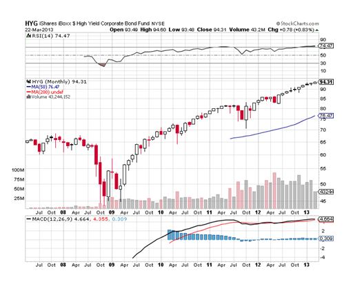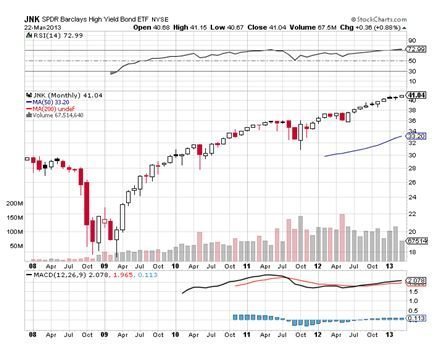 The ETF (JNK), which I have been aggressively recommending since 2009, has clocked a three year total return of over 250%. In fact, junk bonds have outperformed stocks by a substantial margin since the great bull market began in March, 2009.